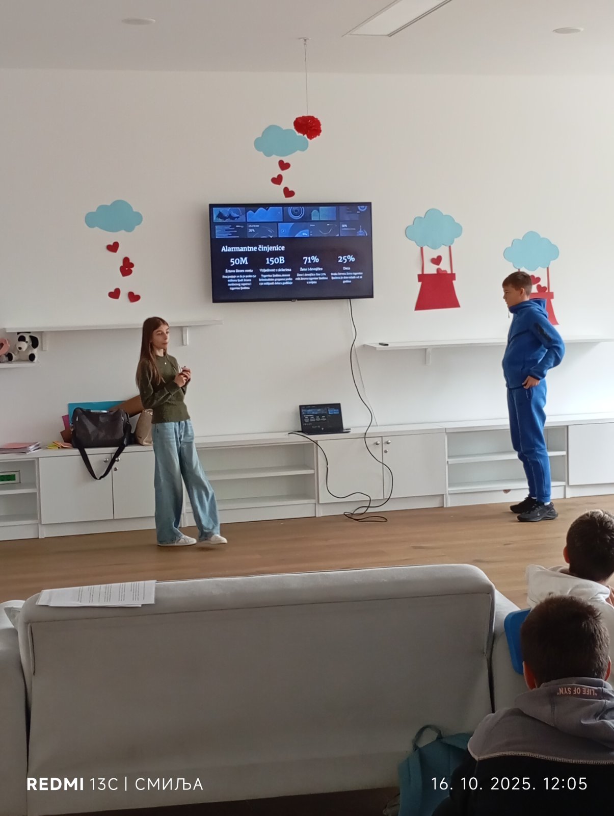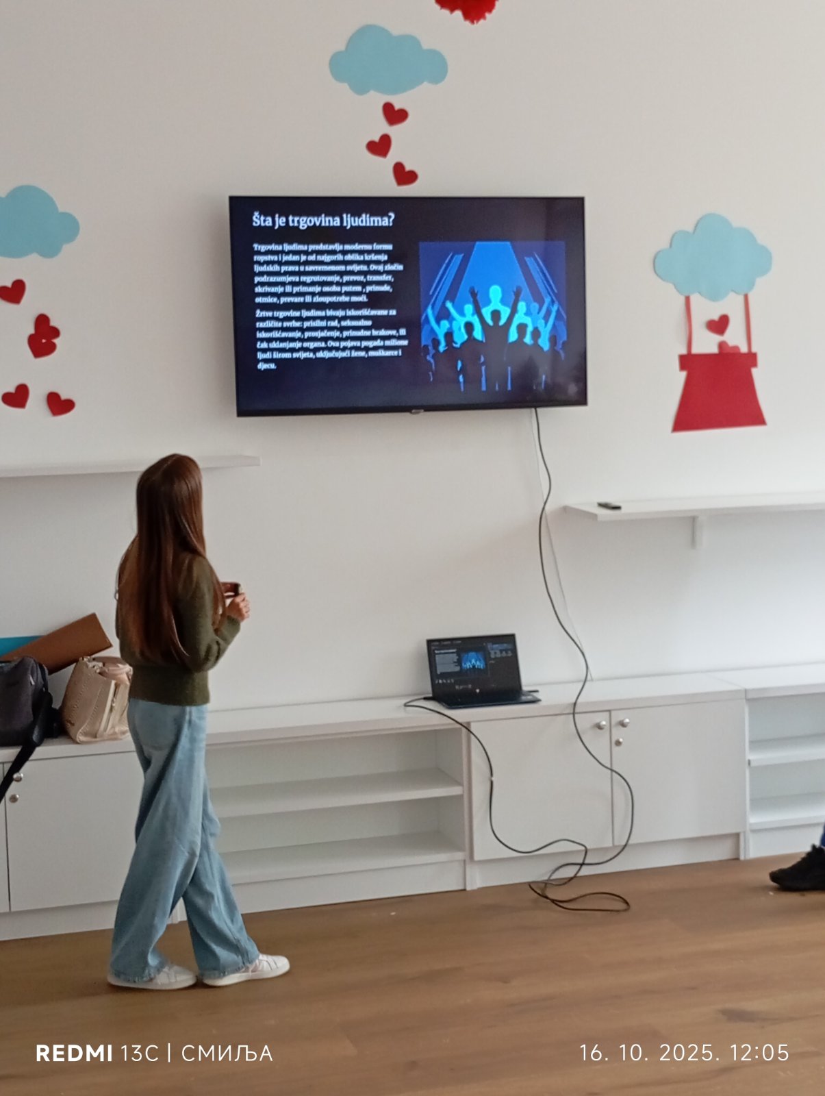 Кроз циљану слајд презентацију, видео клип и групни рад, ученици су се упознали са начинима на који се регрутују жртве, како се њима манипулише, које су транзитне земље за ову врсту „бизниса“, као и како препознати жртву, помоћи јој и како саме себе заштитити да и ми не постанемо жртве.