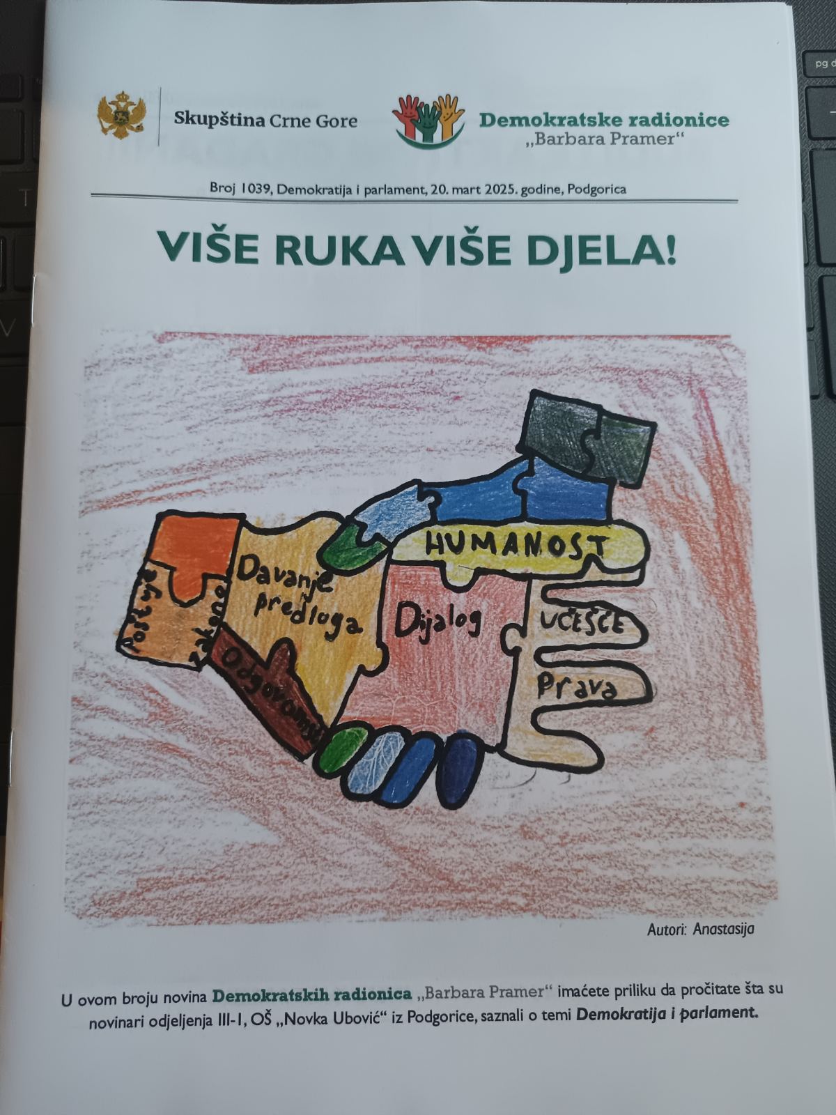 Produkt rada su bile novine koje su djeca sama kreirala. Pisali su tekstove, pjesme na zadatu temu, izražavali se kroz crtež. Imali su priliku da uživo vide skupštinsku salu, prisustvuju dijelu sjednice koja je bila u toku. U Bijelom salonu su razgovarali o ustanovi u kojoj se nalaze.