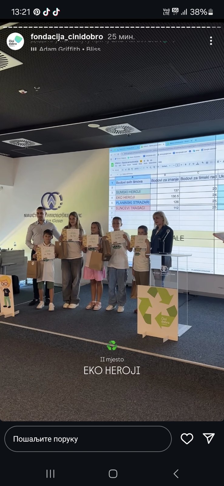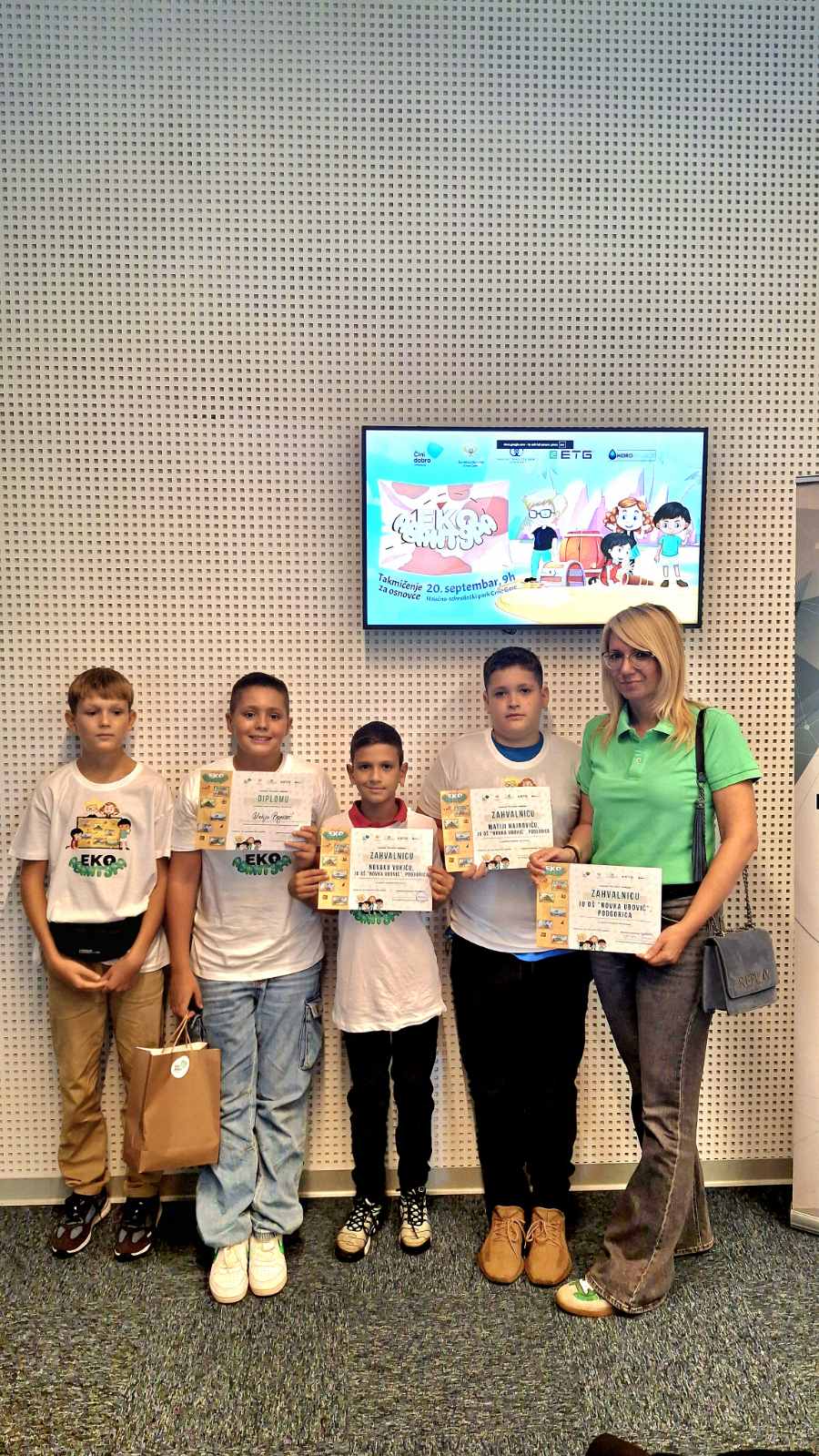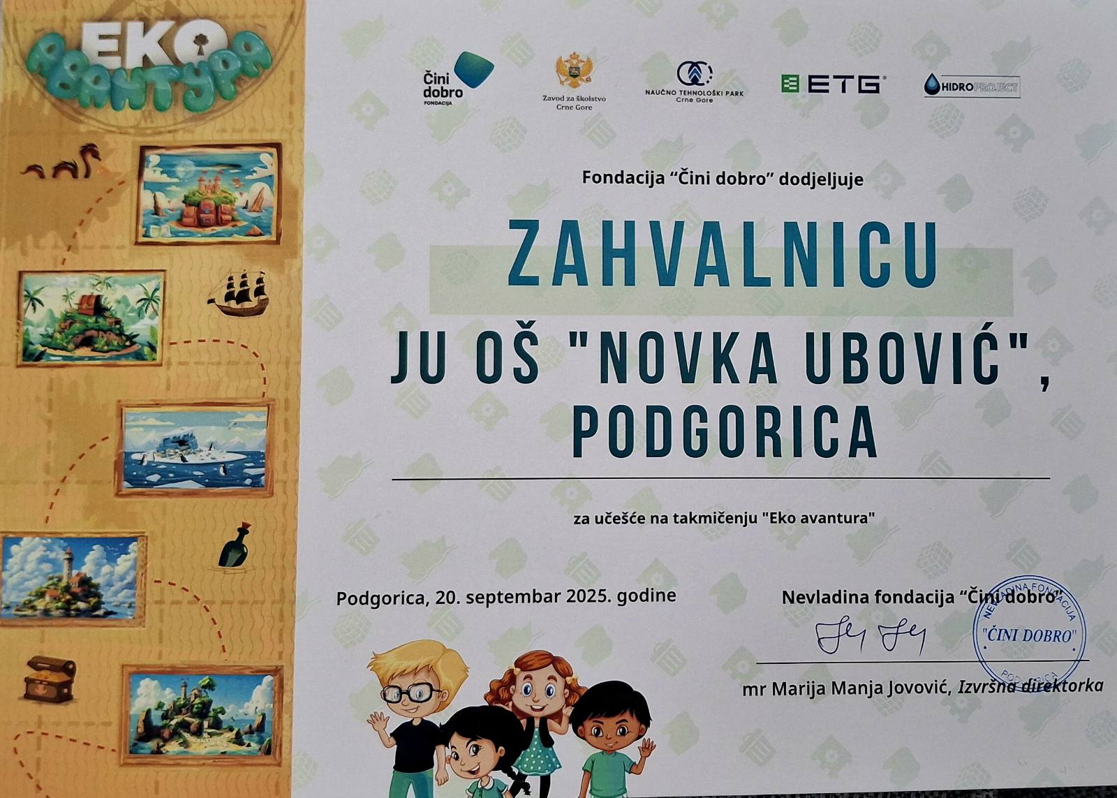 Fondacija „Čini dobro“, u saradnji sa Zavodom za školstvo i Naučnim parkom Crne Gore, povodom Dana ekološke Crne Gore 20. 9. 2025. godine u prostorijama NTP-a, organizovala je takmičenje „Eko avantura“. Predvođeni nastavnicom Biljanom Pejović iz naše škole takmičili su se učenici Vukić Novak, Skutelnik Danyl, Hajrović Matija, Bojović Matija i Banović Petar.