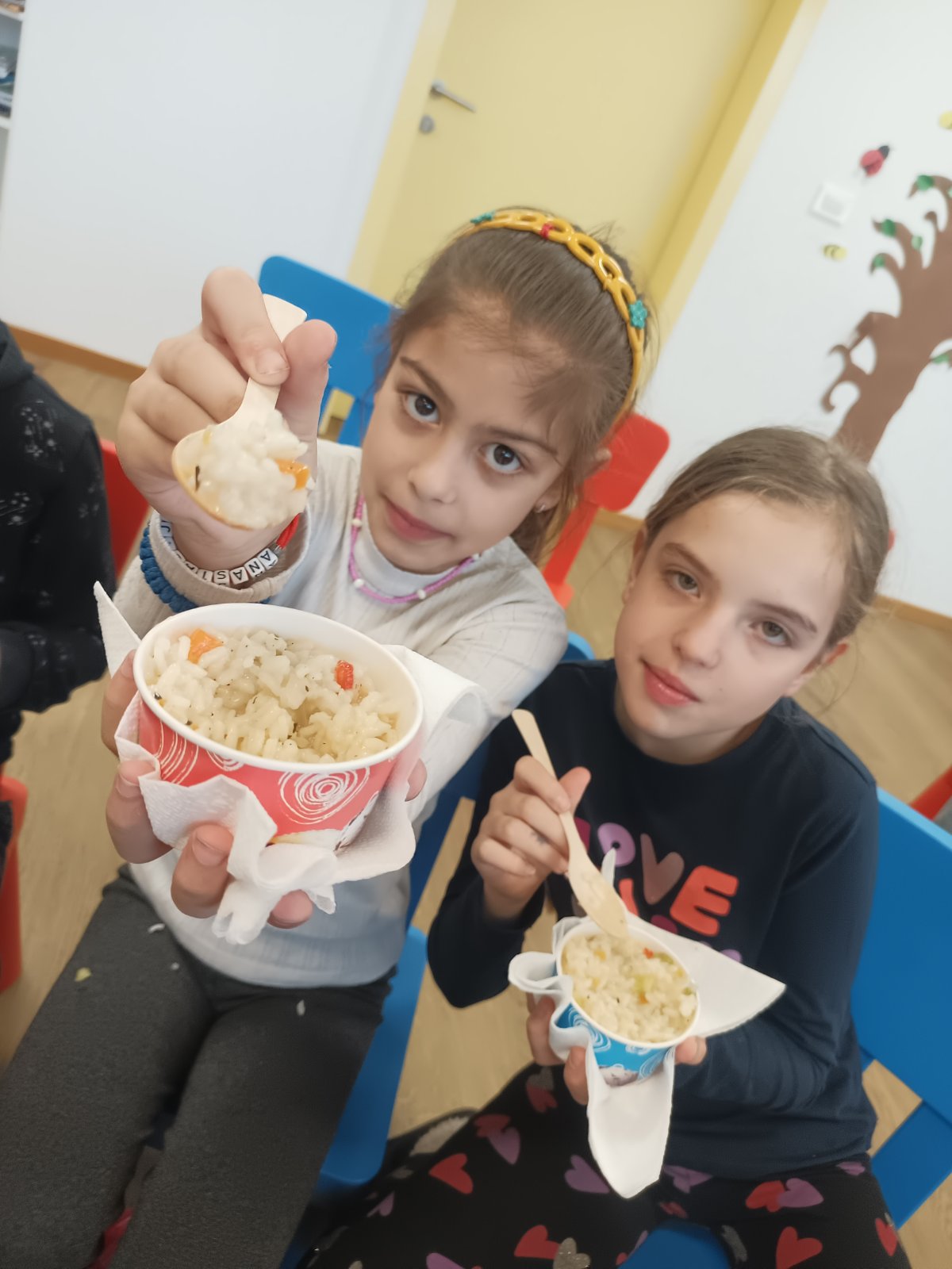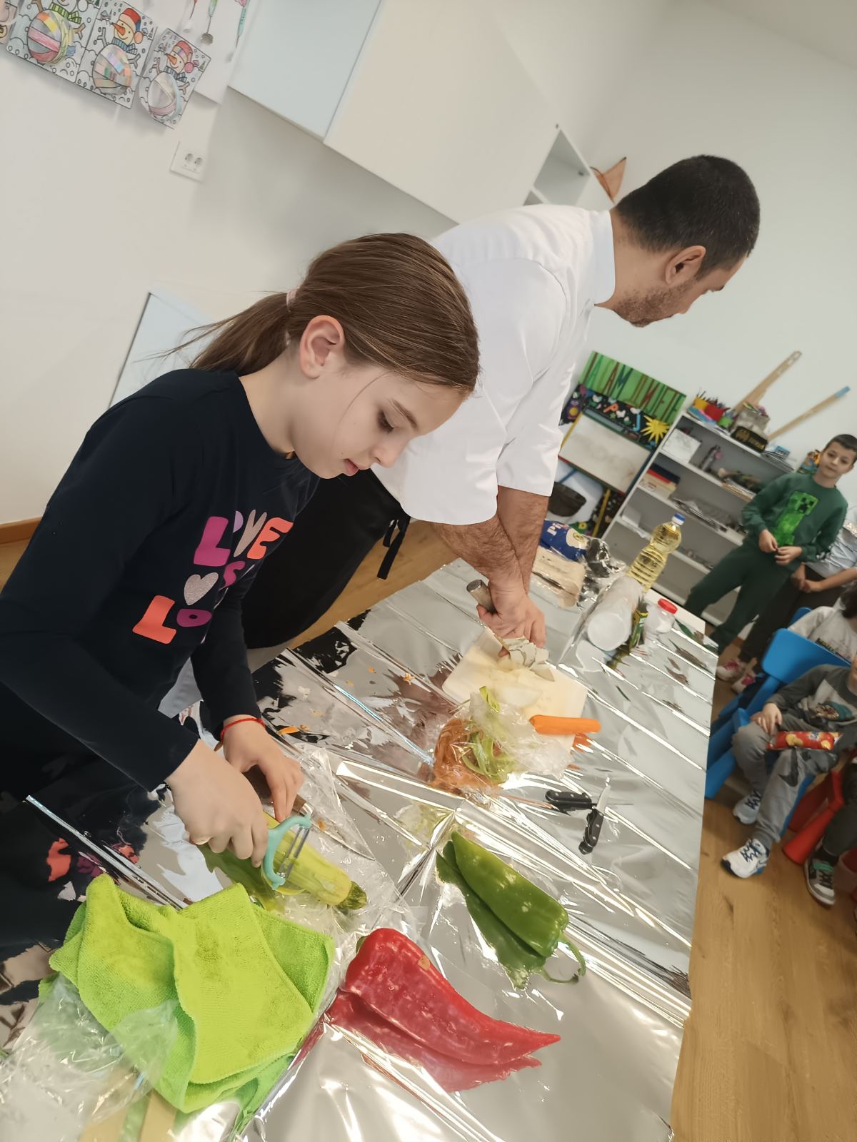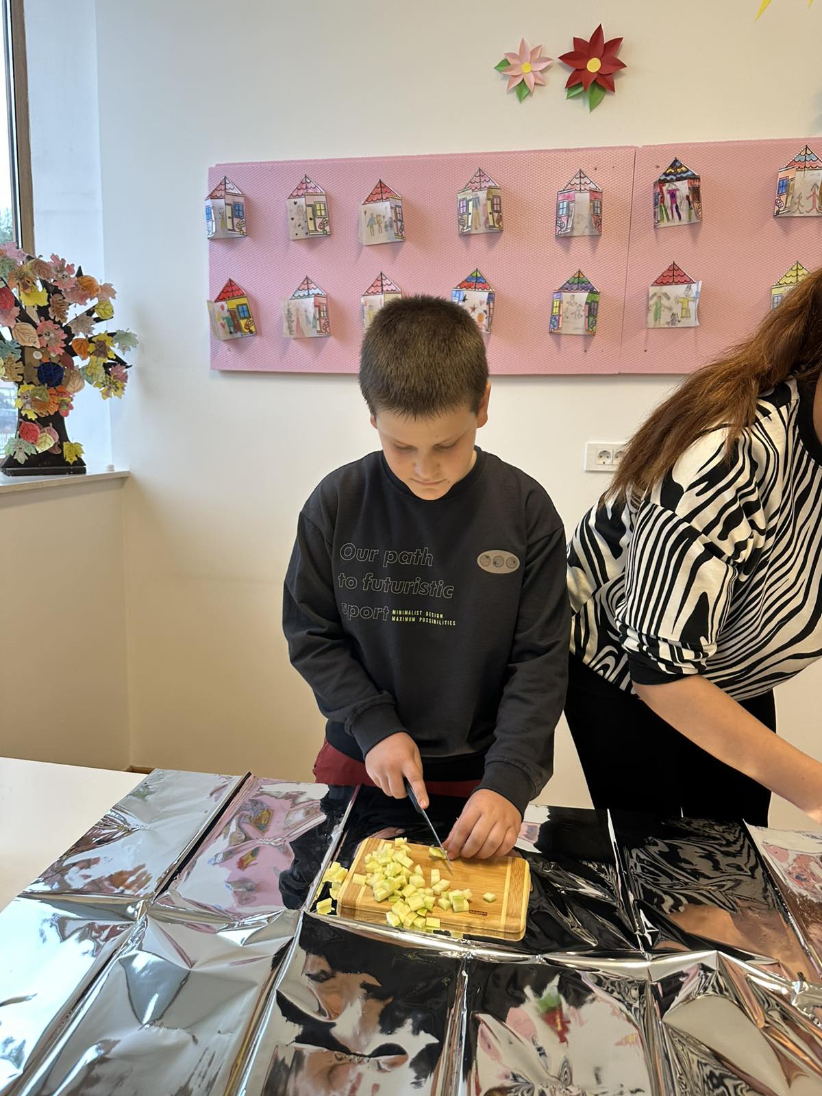 Nijesmo samo pričali. Djeca su bila pomoćni kuvari u našoj kuhinji i uz kontrolu pomagali da se pripremi riža. Gulili su prethodno oprano povrće, sjeckali i nestrpljivo čekali da hrana bude gotova.